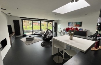 - Au rez-de-chaussée : un hall d'entrée, un bureau (11m²), un WC séparé, une buanderie (13m²) donnant sur un accès latéral, une salle de sport avec réserve (21m²), un vaste séjour lumineux (60m²) avec feu au bois et une cuisine Siematic ultra équipée.